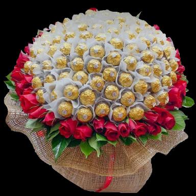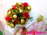 ช่อเฟอเรโร่ เฟอเรโร่ จำนวน 20 ลูก +ดอกกุหลาบแดงจำนวน 12 ดอก ห่อช่อโทนสีขาว ทอง น้ำตาล ผูกโบว์แดงน้ำตาลอย่างสวยงาม